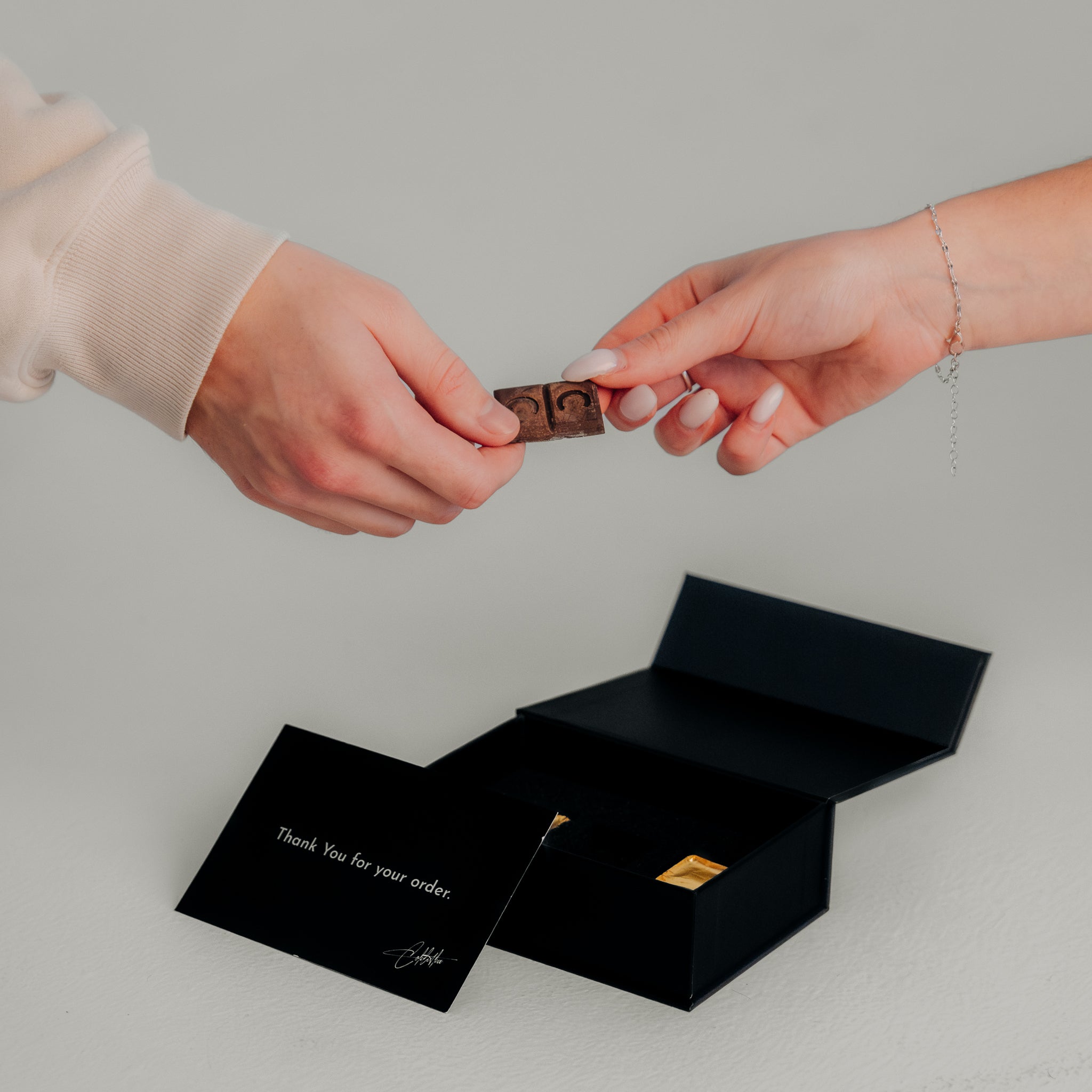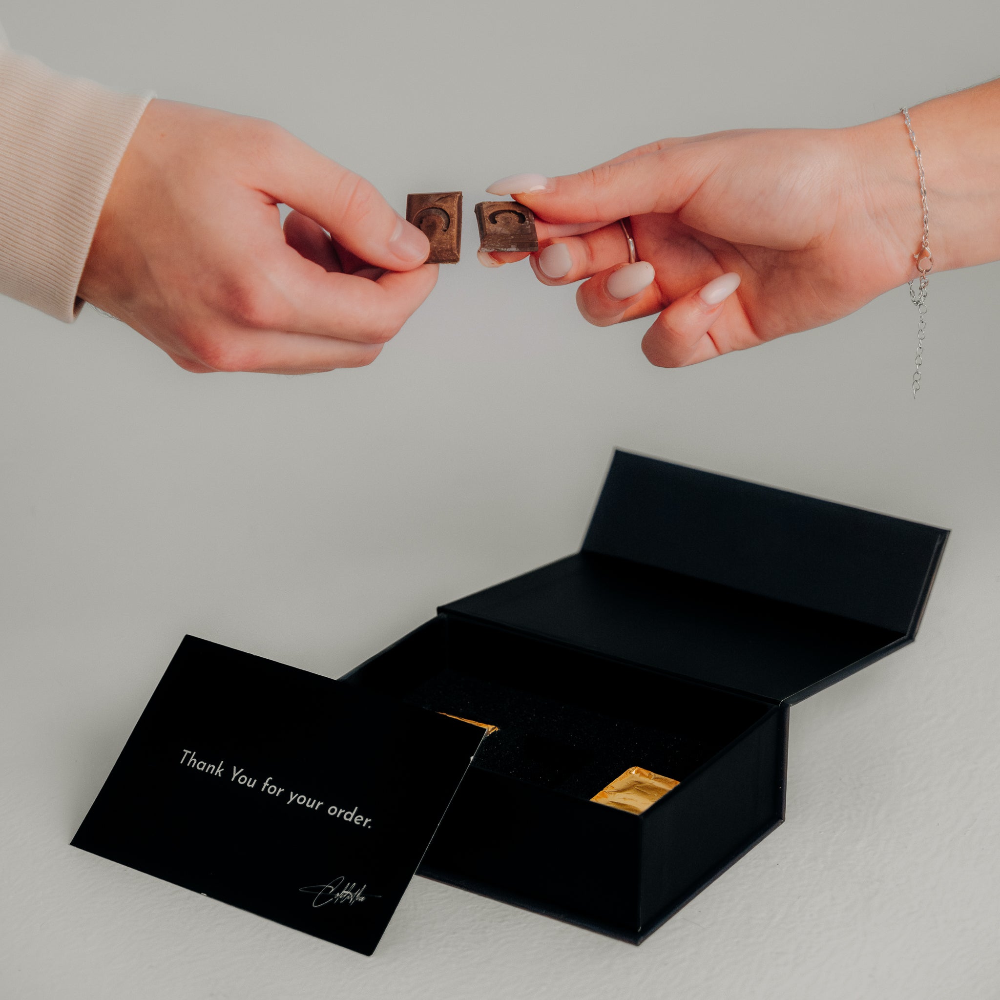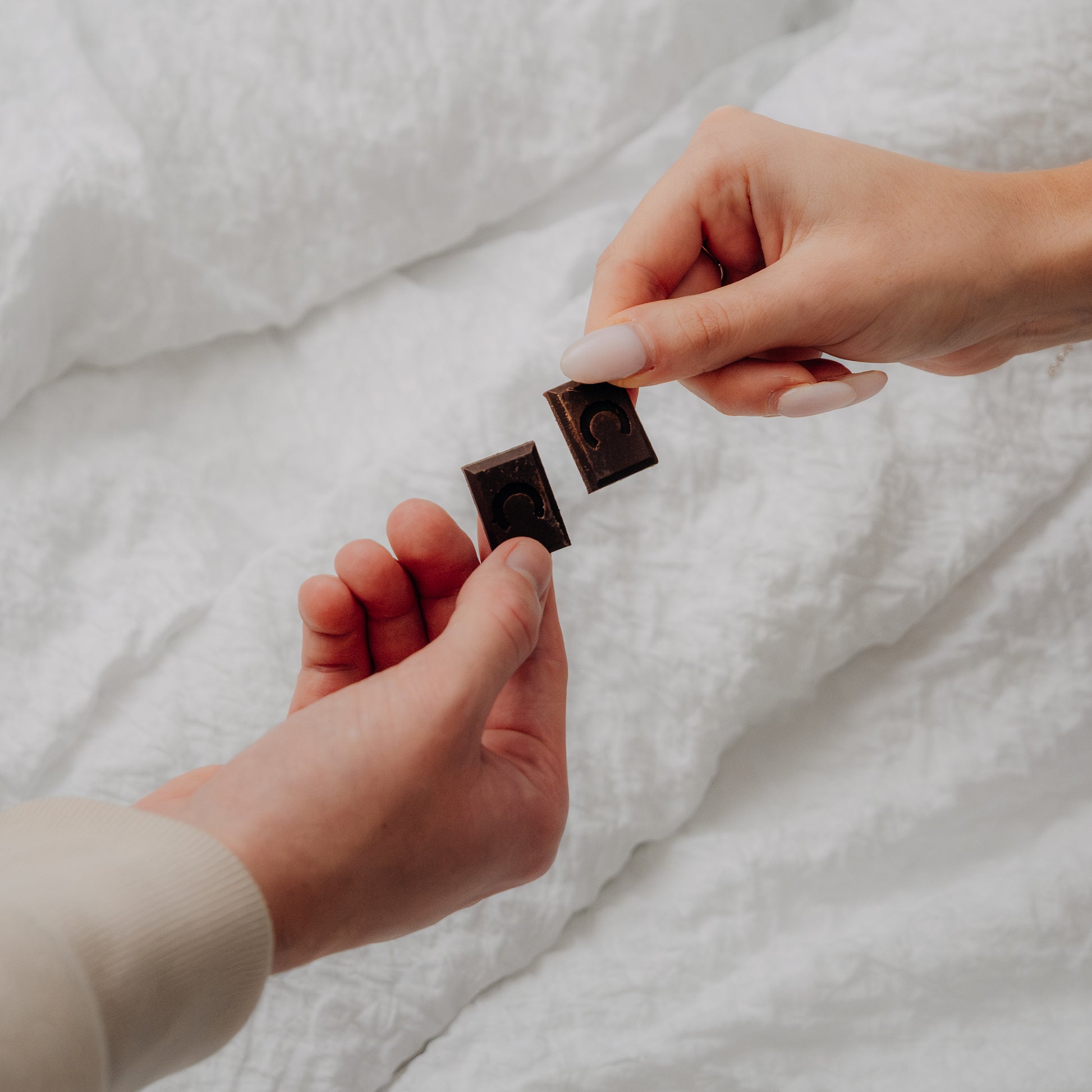 Vezmite čokoládu a jemne ju rozlomte na dve rovnaké polovice. Jedna polovička ide vám a druha vášmu partnerovi.